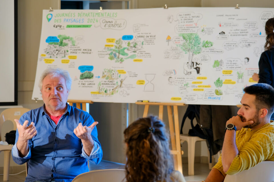 C’est pour apporter quelques éléments de réponse que le CAUE de l’Ardèche et ses partenaires ont organisé les Journées départementales des paysages les 3 et 4 octobre sur la thématique de l’arbre « échappé de la forêt ». Deux journées en compagnie du géographie Bruno SIRVEN pour partager des expériences, échanger, éprouver sur le terrain, puis pratiquer.